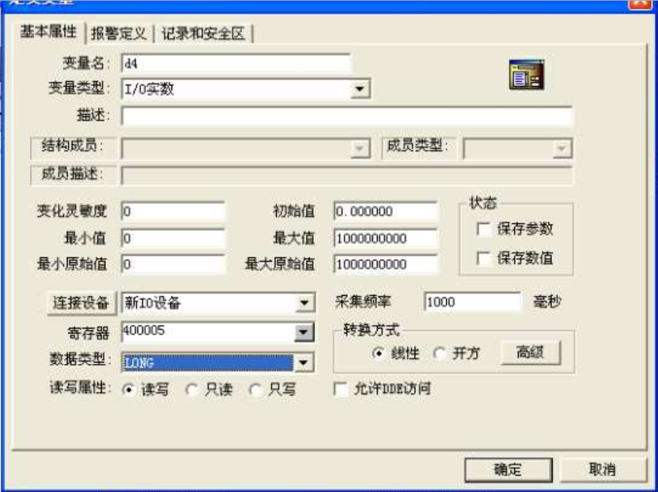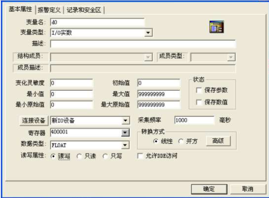 注意:屬性連接, 具體請參照組態(tài)王手冊 。 這里只以浮點數(shù) D0(模擬值輸出)為例,